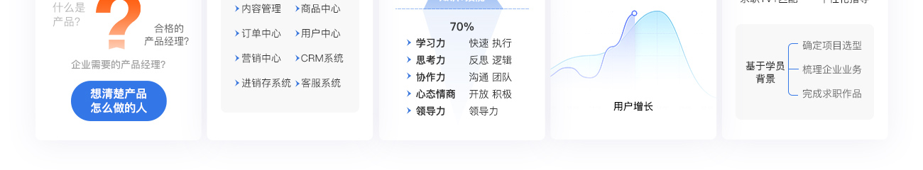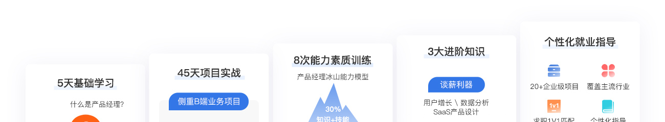 新增產(chǎn)品基礎(chǔ)、電商項目、移動端項目實戰(zhàn)、項目管理、互聯(lián)網(wǎng)金融